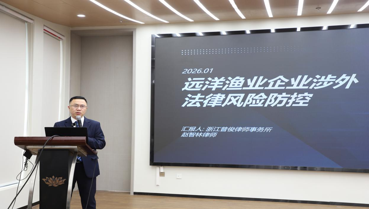 1月15日,舟山远洋渔业协会举办全市远洋渔业外籍船员管理服务行业恳谈会暨远洋法规专题讲座,浙江普俊律师事务所赵智林律师受邀作为特邀嘉宾出席,并带来《远洋渔业企业涉外法律风险防控》的专题讲座。
